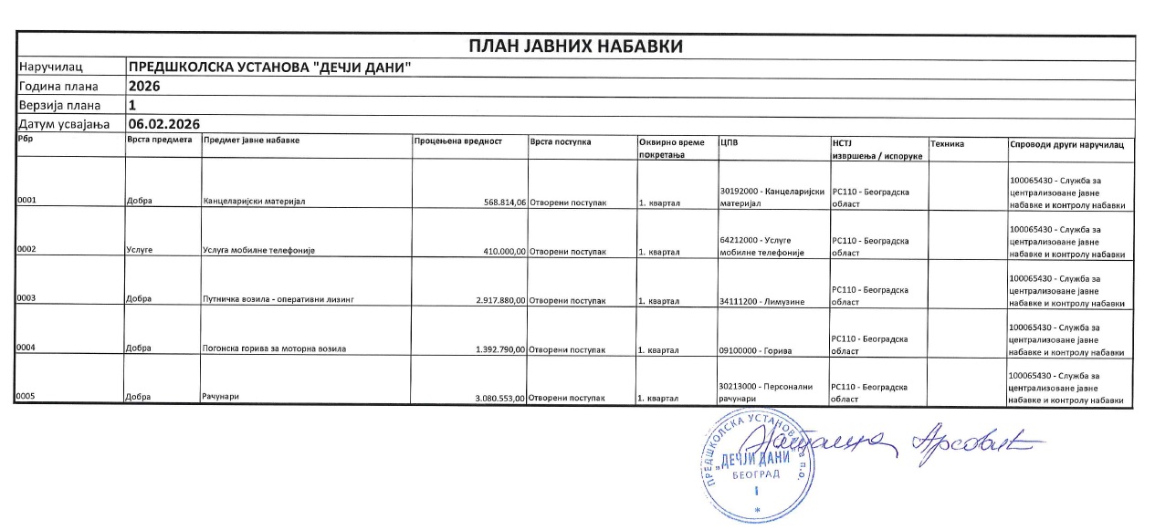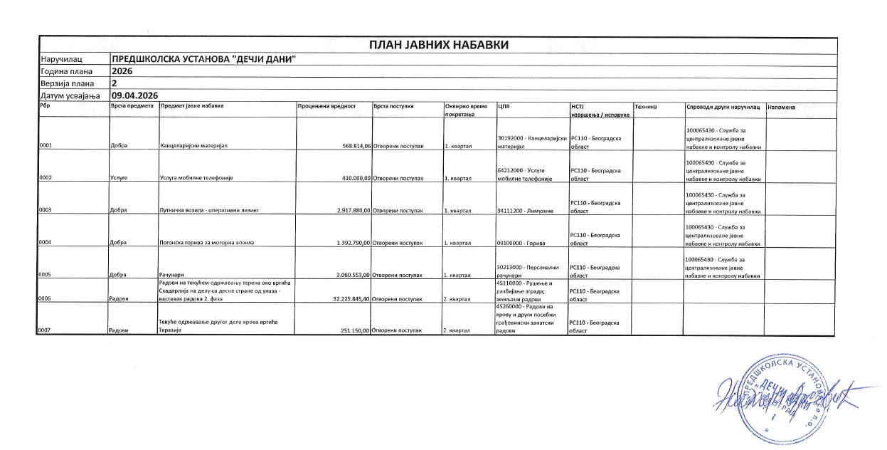 ПРАВИЛНИК ПРЕДШКОЛСКЕ УСТАНОВЕ “ДЕЧЈИ ДАНИ” О НАЧИНУ ОБАВЉАЊА ПОСЛОВА ЈАВНИХ НАБАВКИ, НАБАВКИ НА КОЈЕ СЕ ЗАКОН НЕ ПРИМЕЊУЈЕ И НАБАВКИ ДРУШТВЕНИХ И ДРУГИХ ПОСЕБНИХ УСЛУГА