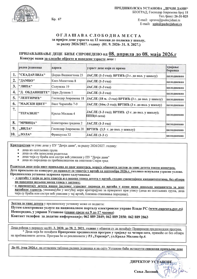 Овде можете преузети информације о Конкурсу за упис деце за радну 2026/2027. годину